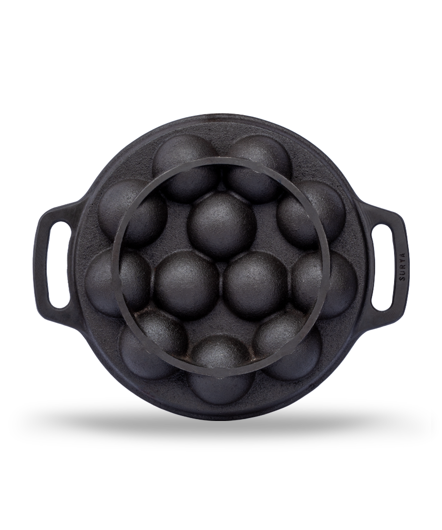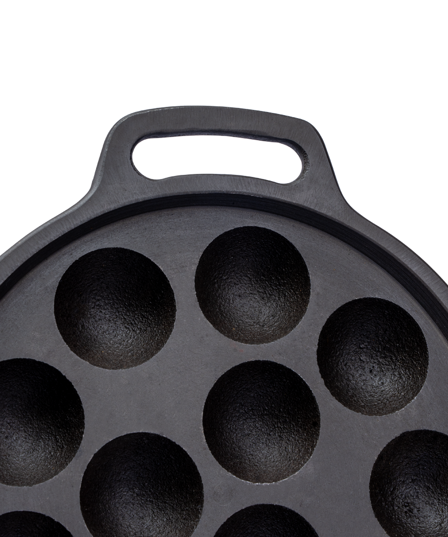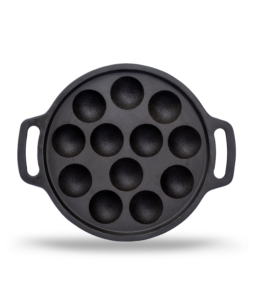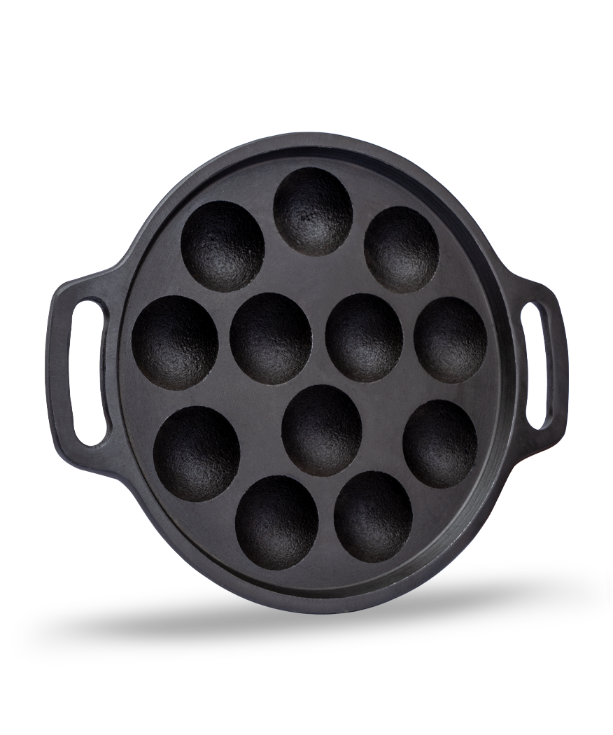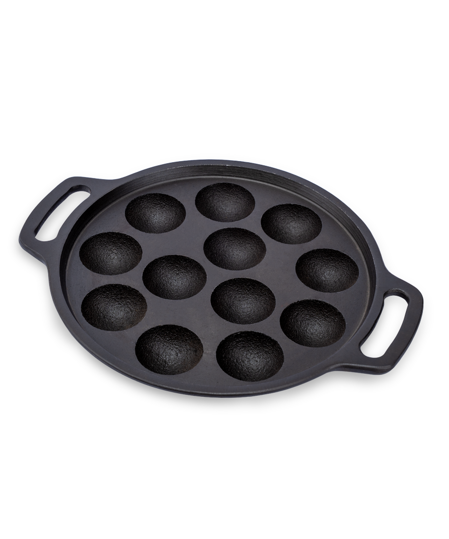 A traditional cast iron kuzhi paniyarakal designed to bring out the authentic flavour of paniyaram, paddu, and appe. Thick, sturdy, and handcrafted for everyday South Indian cooking.