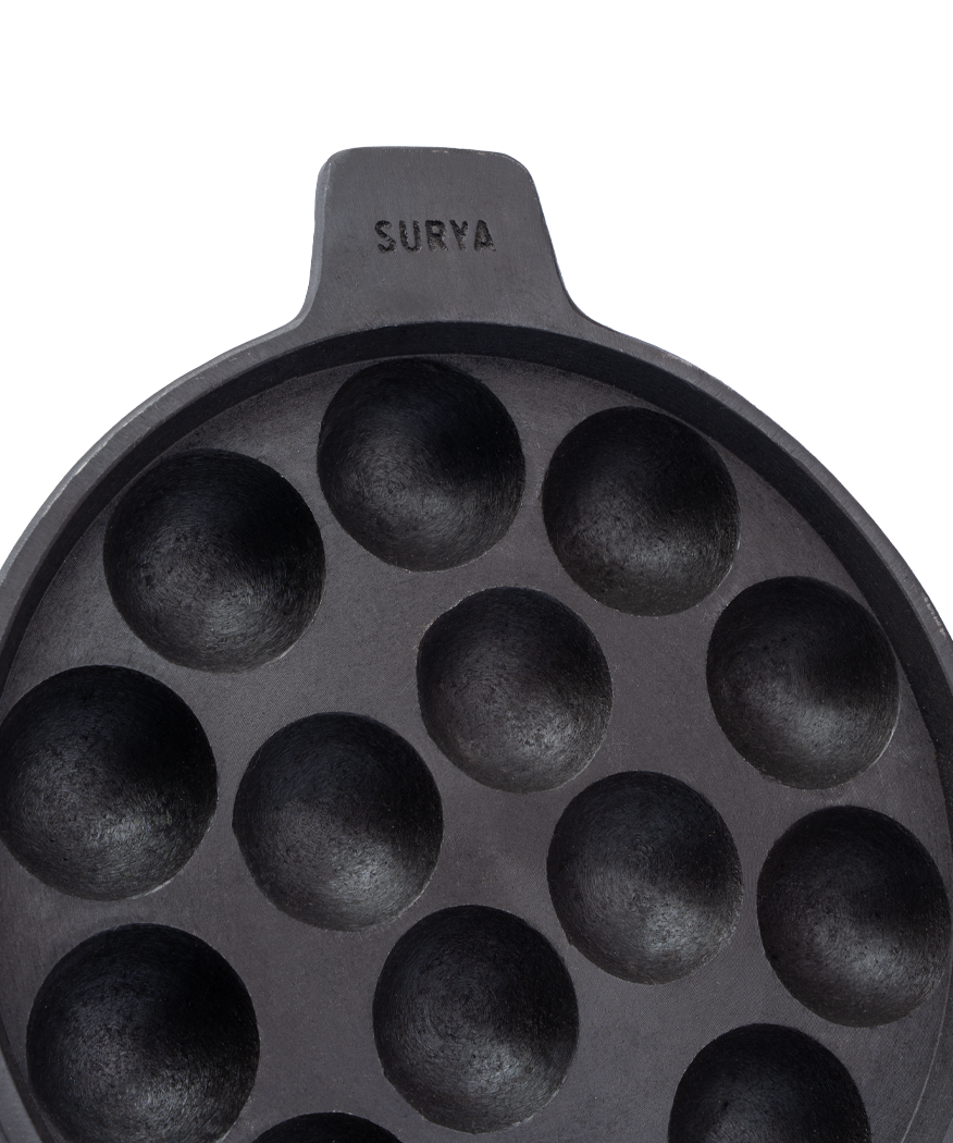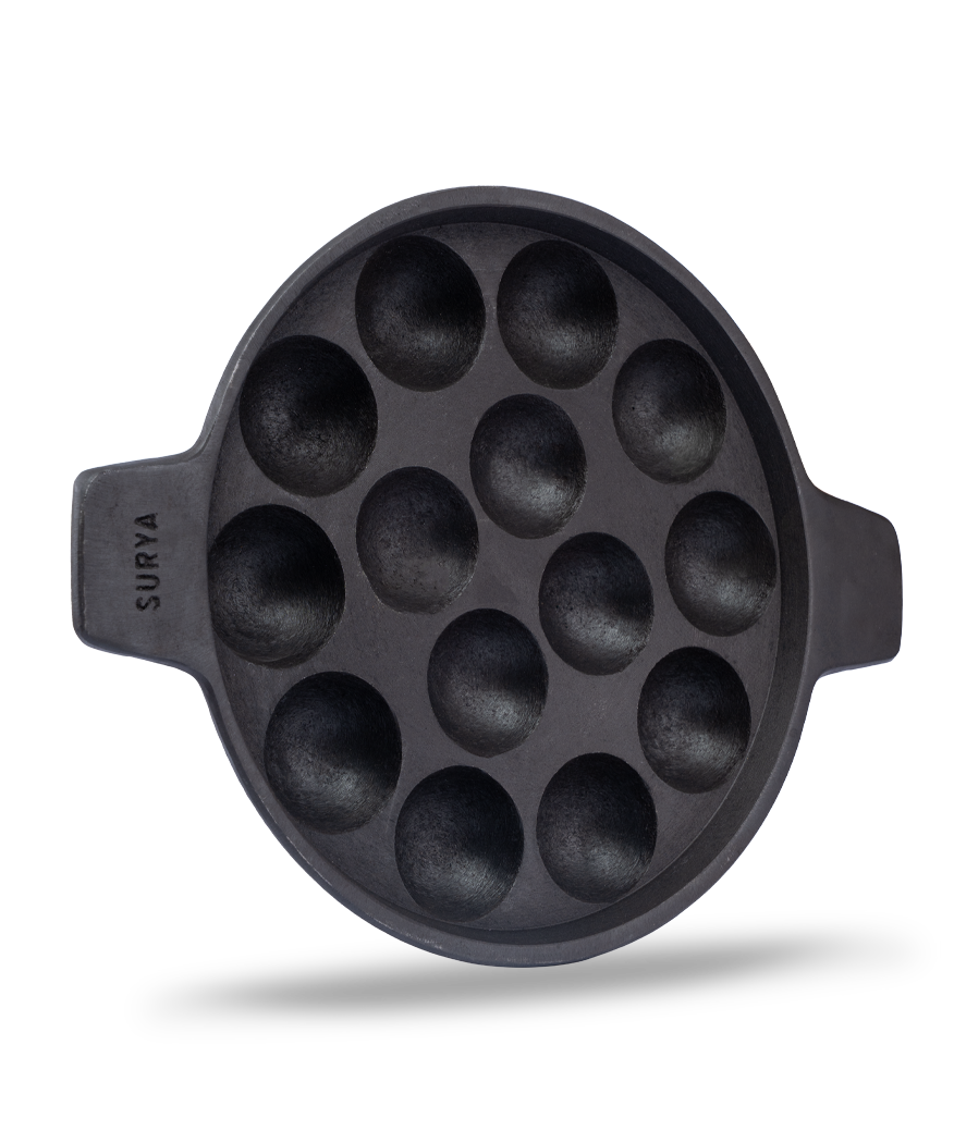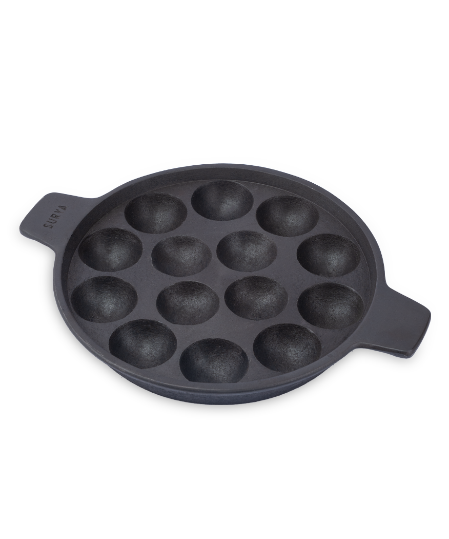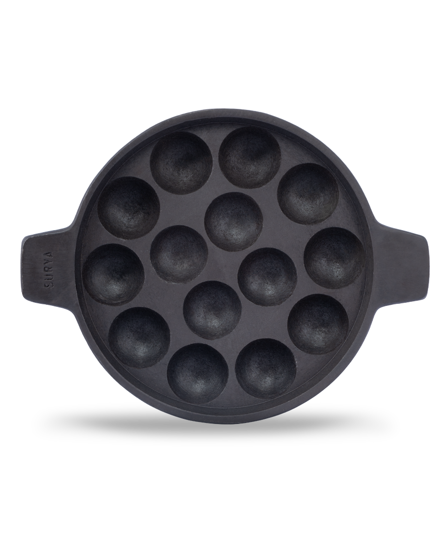 A traditional cast iron kuzhi paniyarakal designed to bring out the authentic flavour of paniyaram, paddu, and appe. Thick, sturdy, and handcrafted for everyday South Indian cooking.