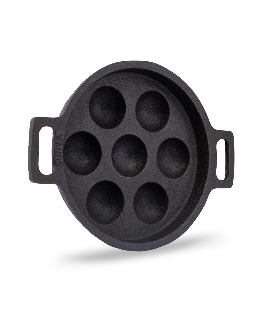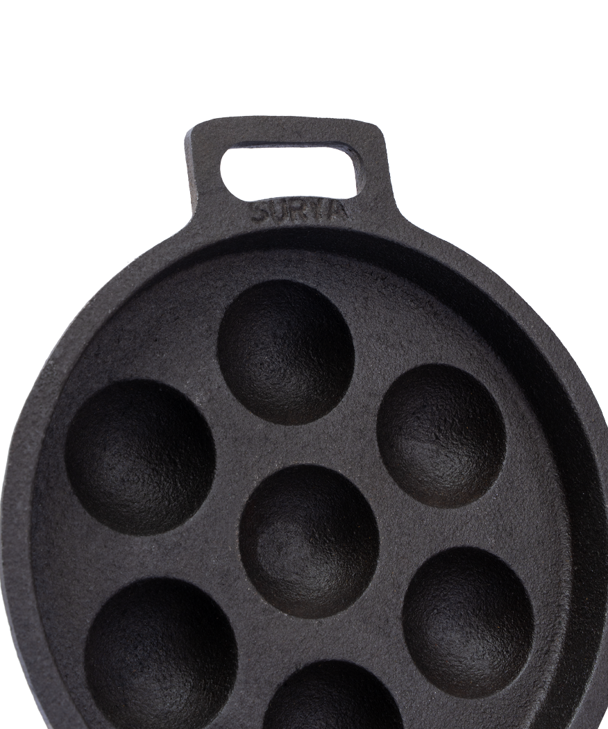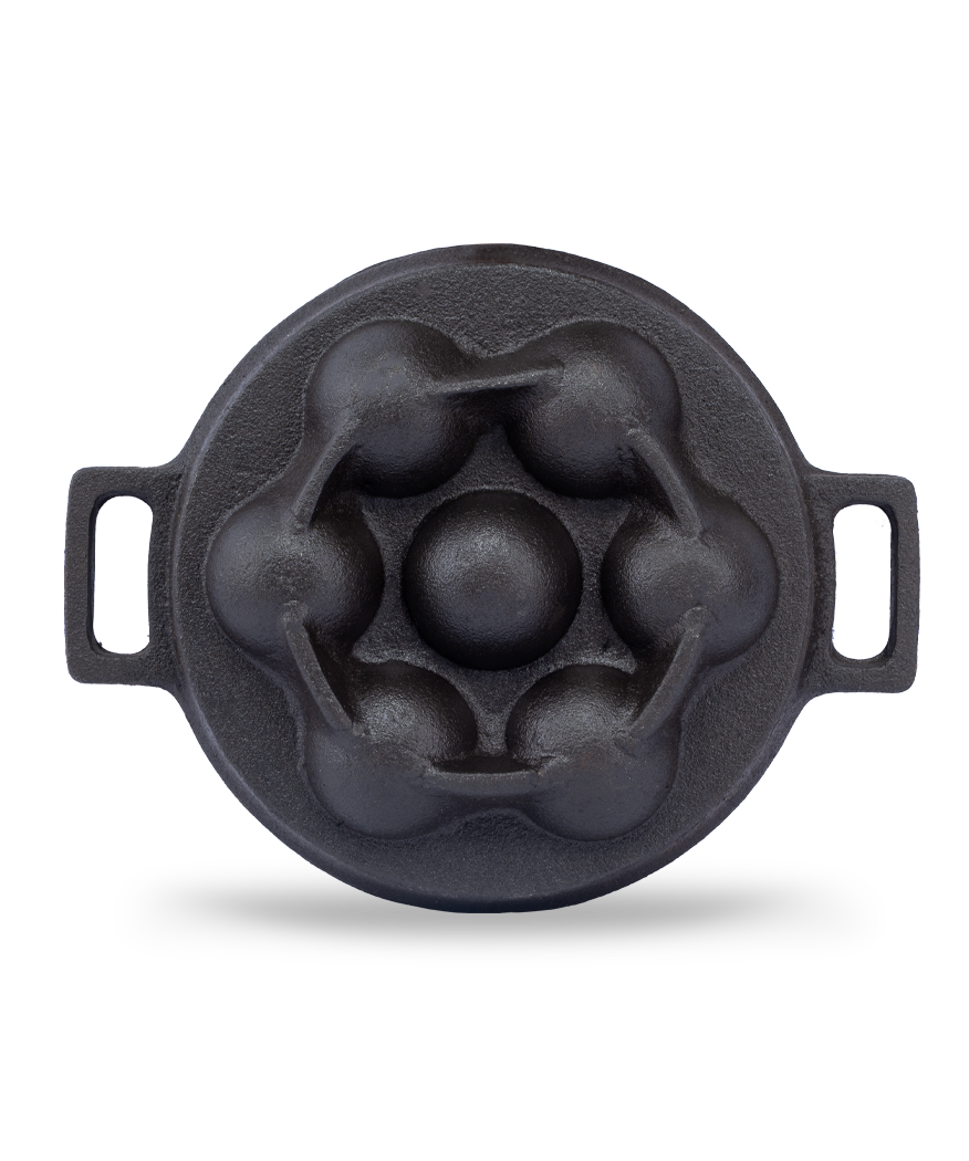 A traditional cast iron kuzhi paniyarakal designed to bring out the authentic flavour of paniyaram, paddu, and appe. Thick, sturdy, and handcrafted for everyday South Indian cooking.