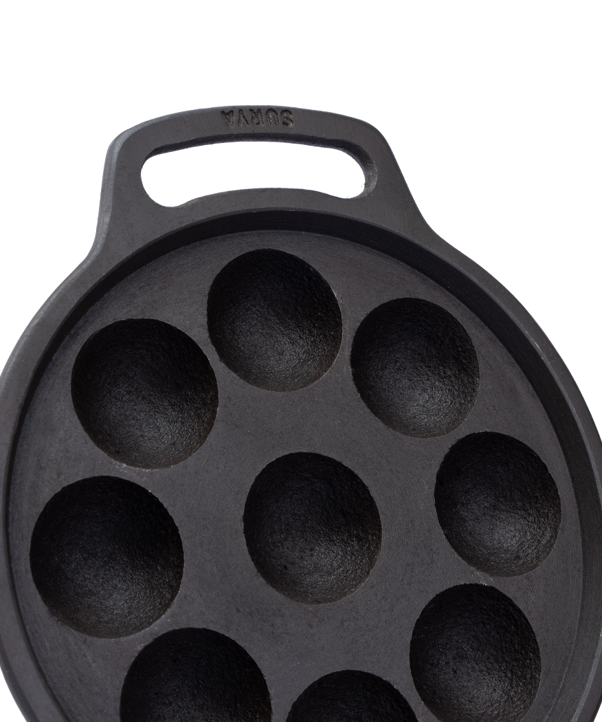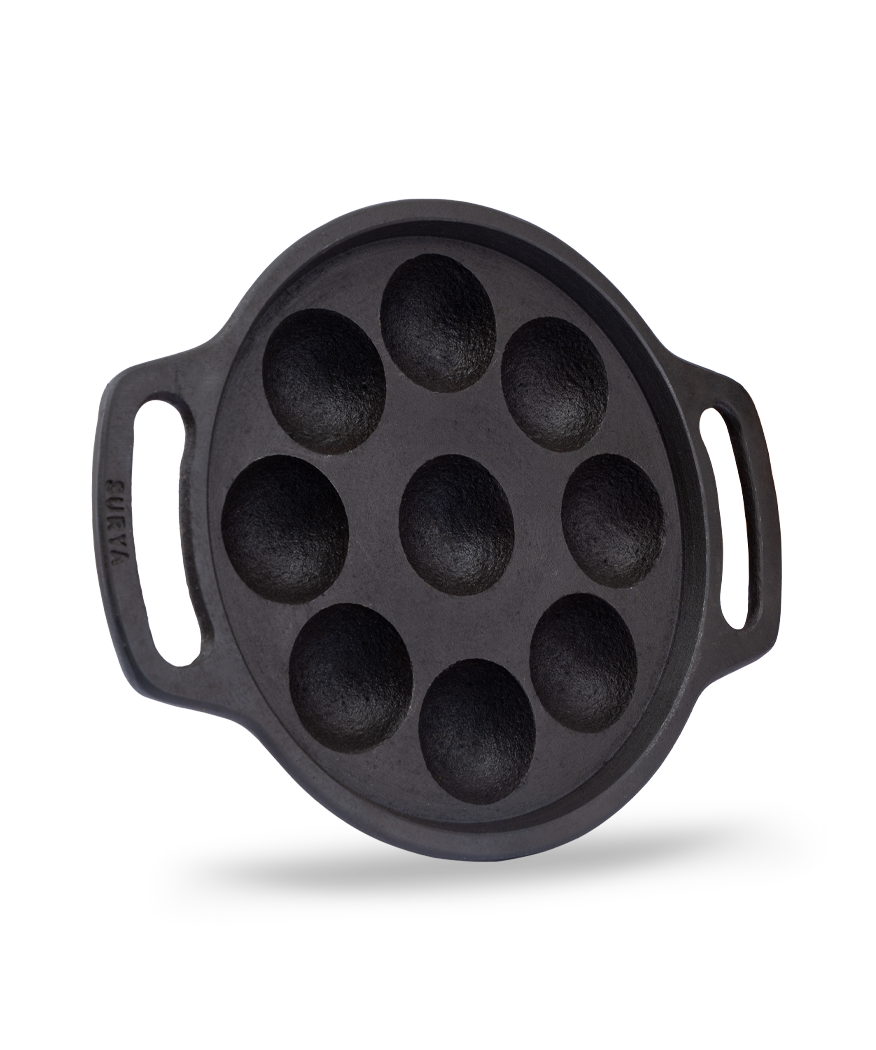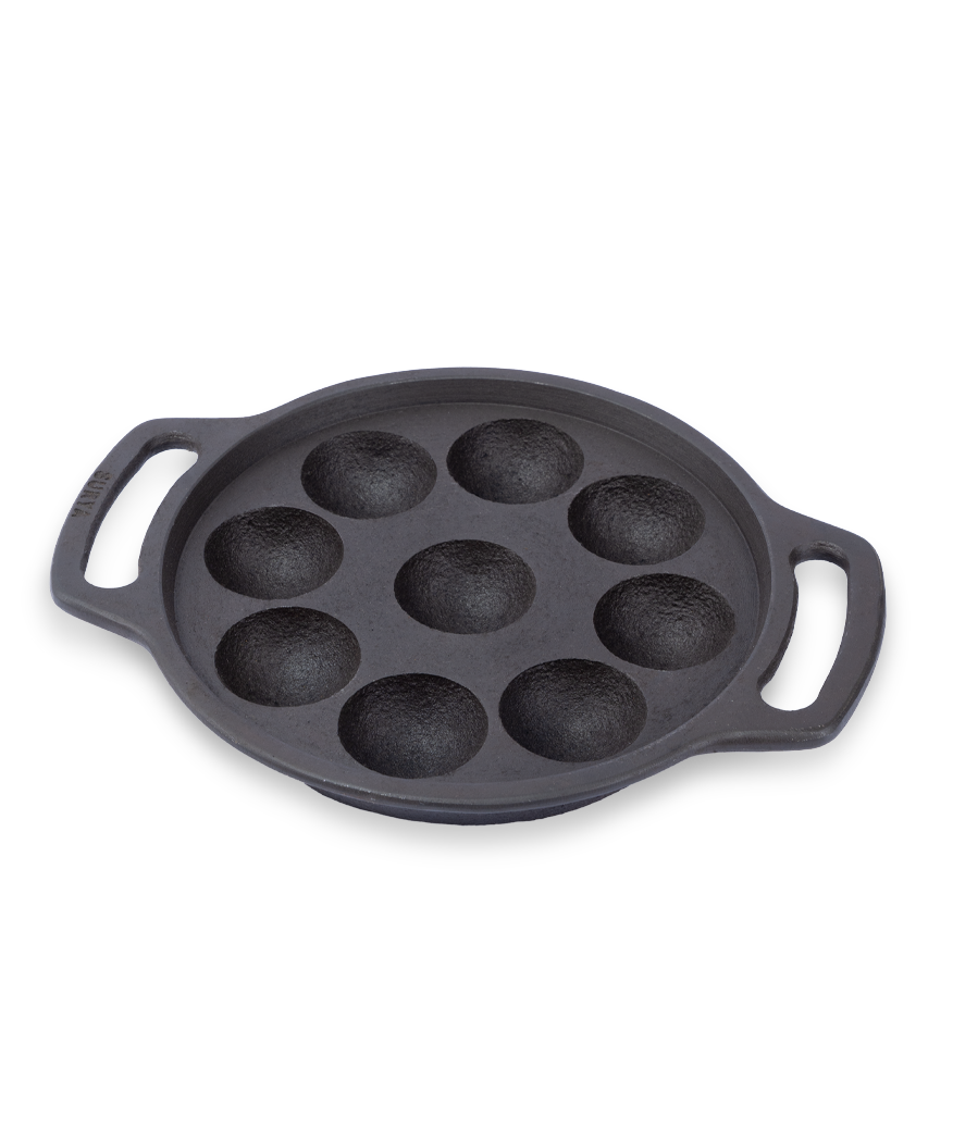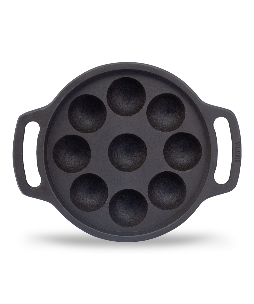 A traditional cast iron kuzhi paniyarakal designed to bring out the authentic flavour of paniyaram, paddu, and appe. Thick, sturdy, and handcrafted for everyday South Indian cooking.