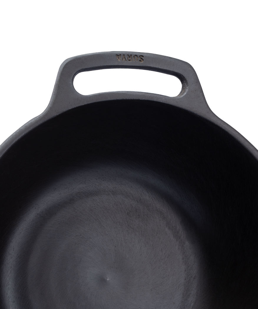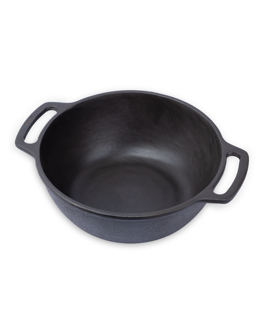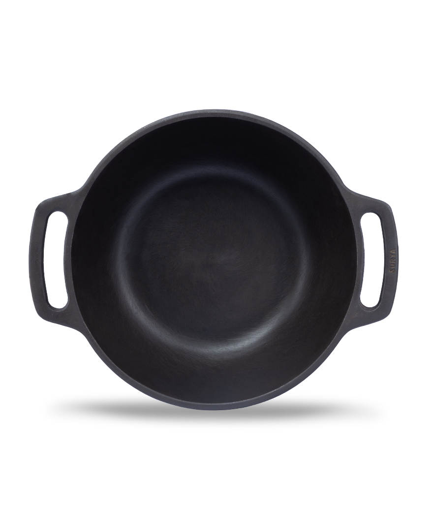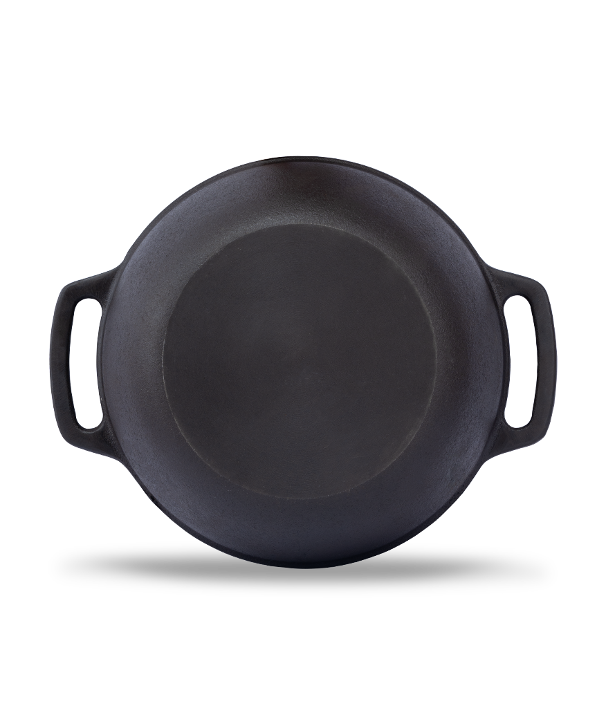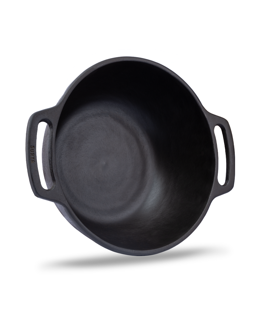A heavy-duty, deep cast iron kadai designed for everyday Indian cooking—perfect for frying, sautéing, and slow-cooked dishes that need space, depth, and steady heat.