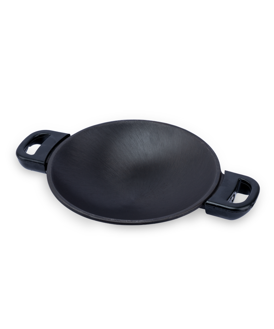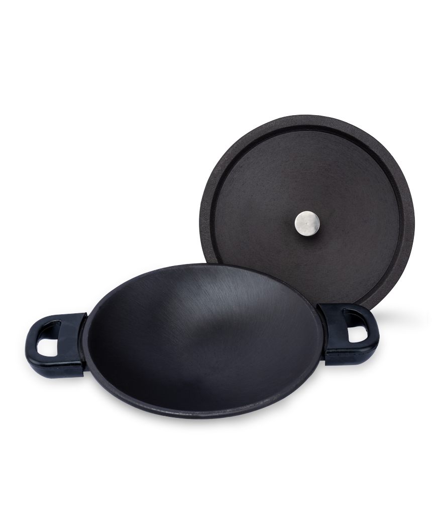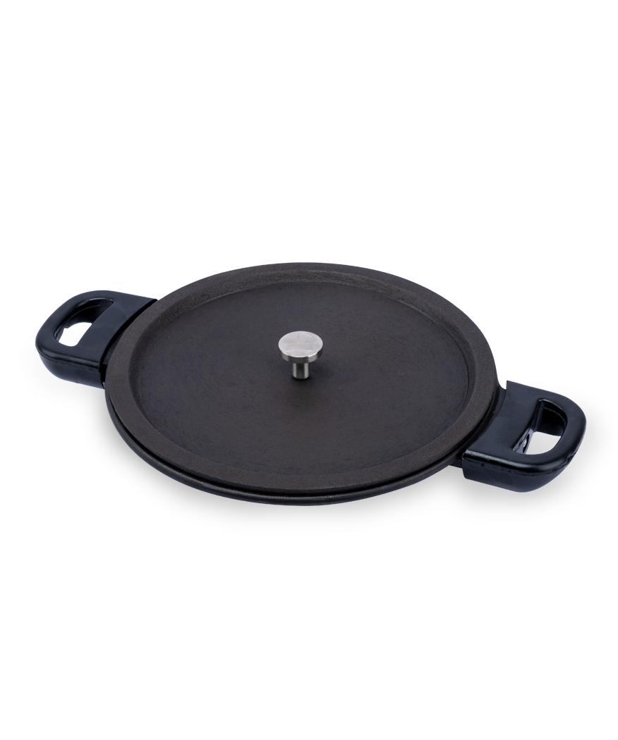A premium cast iron appam pan with a sturdy handle and fitted lid, designed to help you make soft, fluffy appams with perfectly crisp edges. The handle offers easy control, while the lid locks in heat for beautiful fermentation rise