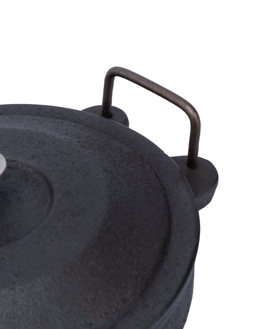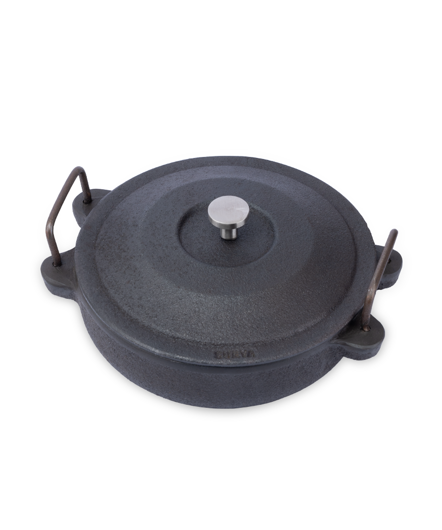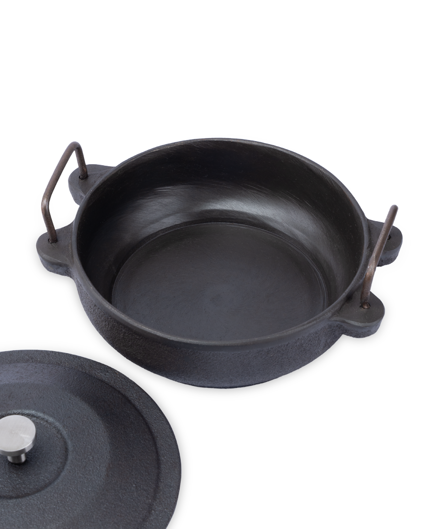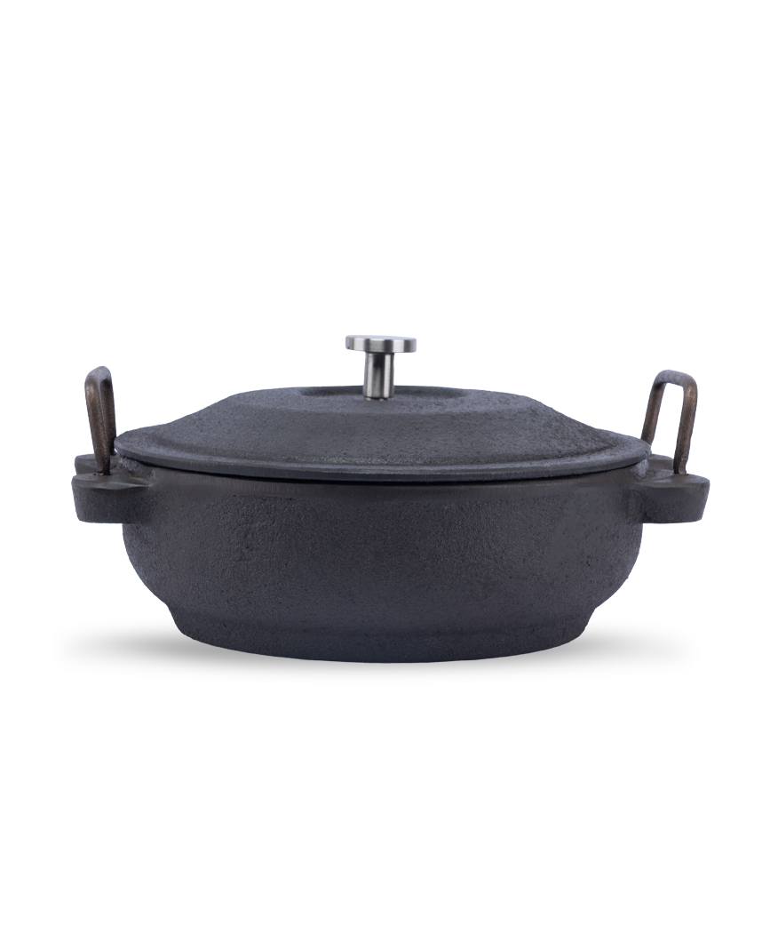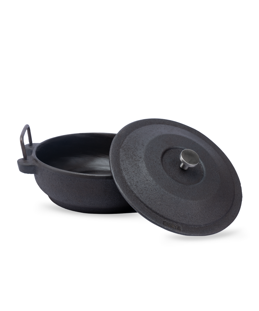 A deep, heavy-duty cast iron kadai paired with a perfectly fitting lid —crafted for everyday Indian cooking. Ideal for frying, searing, sautéing, and slow cooking, all in one versatile pot.